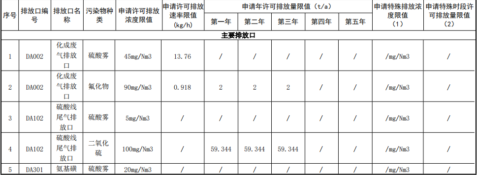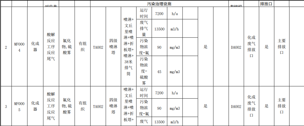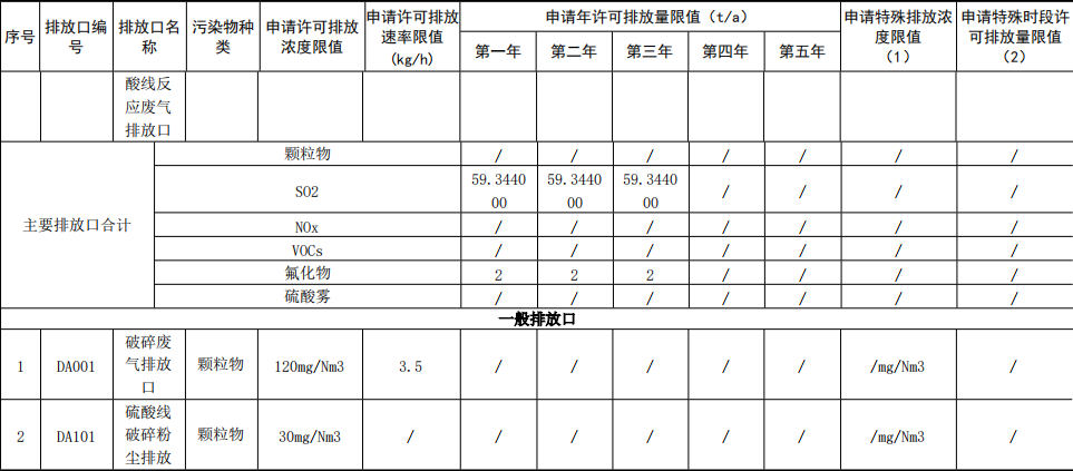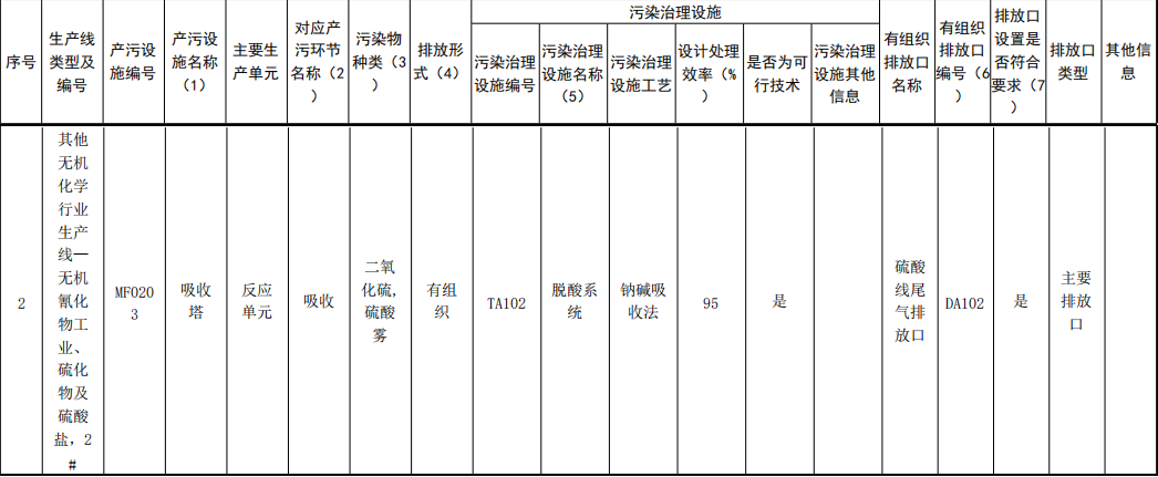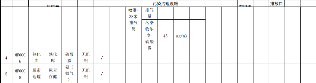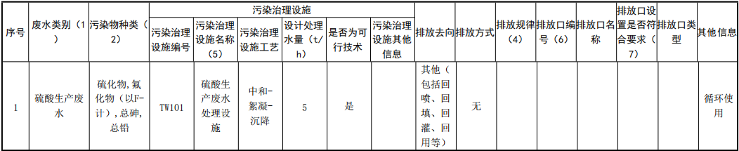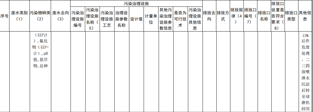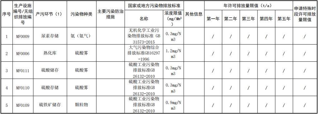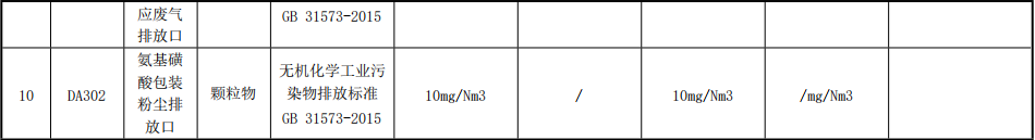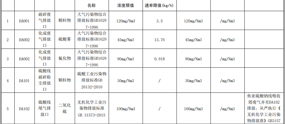 湖北龙祥磷化有限公司环境信息公示 湖北龙祥磷化有限公司,现有10万吨/年过磷酸钙生产线、20万吨硫铁矿制酸生产线、2万吨/年氨基磺酸生产线(试生产阶段)各一条(焦亚硫酸钠生产线建成未生产),公司统一社会信用代码:91420684726129188X,排污许可证编号:91420684726129188X001Q,公司2022年主要污染物为:颗粒物、二氧化硫、其他特种污染物(硫酸雾、氟化物,氨(氨气))、COD、氨氮其他特征污染物(硫化物,氟化物(以F-计),总砷,总铅,总氮(以N计),总磷以(以P计),PH值,悬浮物)。公司自建成以来秉承着环保大于一切的理念,严格遵守国家相关法律法规,主动增强、改善相关环保治理与预防设施,未发生超标排放情况。现将公司主要污染物的名称、排放方式、排放浓度和总量,以及防治污染设施的建设和运行情况,危废相关信息公示如下: